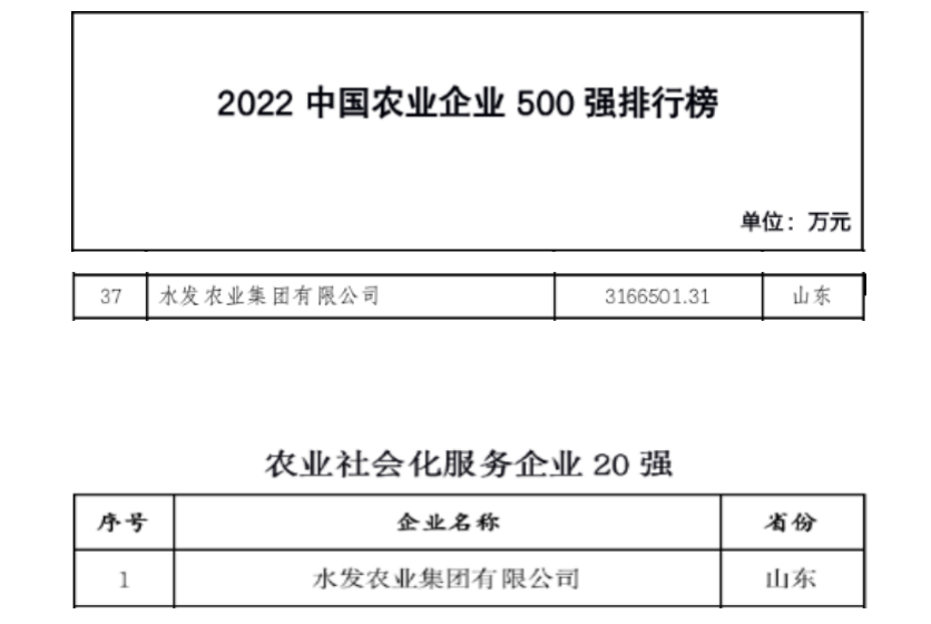 12月23日,“2022中國農業企業500強”榜單正式發布,水發農業集團有限公司(以下簡稱“水發農業”)榮登“2022中國農業企業500強”榜單,排名第37位,較去年上升46位。同時,水發農業還入選了“農業社會化服務企業20強”榜單,排名第1位。